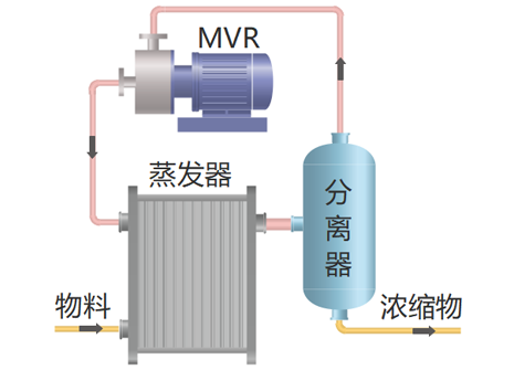 MVR蒸汽壓縮機是此蒸發裝置中核心設備。主要的參數有流量,進、出口溫度(溫升),電流等。蒸汽壓縮機也根據溫升、蒸汽流量不同,有多種選擇,如離心風機、單機高速離心機、容積式羅茨壓縮機等。